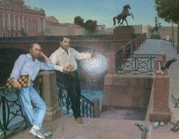 От картины к картине Президент и премьер-министр перемещаются в пространстве, меняются костюмы и декорации. Неизменной остается только одна деталь - шахматы. Вот Путин и Медведев на набережной возле Аничкова моста. Премьер держит в руках шахматы, а президент кормит голубей хлебушком ... Первые лица государства в своем городе прибывают в расслабленном состоянии. Владимир Владимирович одет по-простому в джинсы и рубашку, на ногах у него кроссовки. Видимо, это должно было подчеркнуть спортивный характер второго лица государства. Дмитрий Медведев же себе такой свободы позволить не смог даже на исторической родине, однако галстук он все же оставил дома.